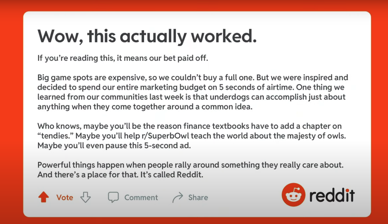 Another great example of the power of Humanology is the Reddit Superb Owl Campaign, Social & Influencer Grand Prix Winner at the Cannes Lions 2021.