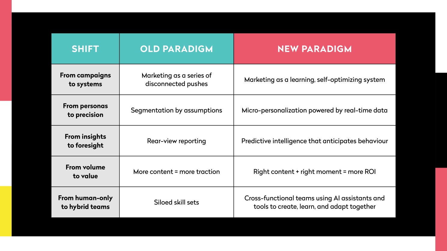 AI isn’t just speeding things up. It’s reshaping how we think about marketing altogether. Here are five fundamental shifts happening right now: